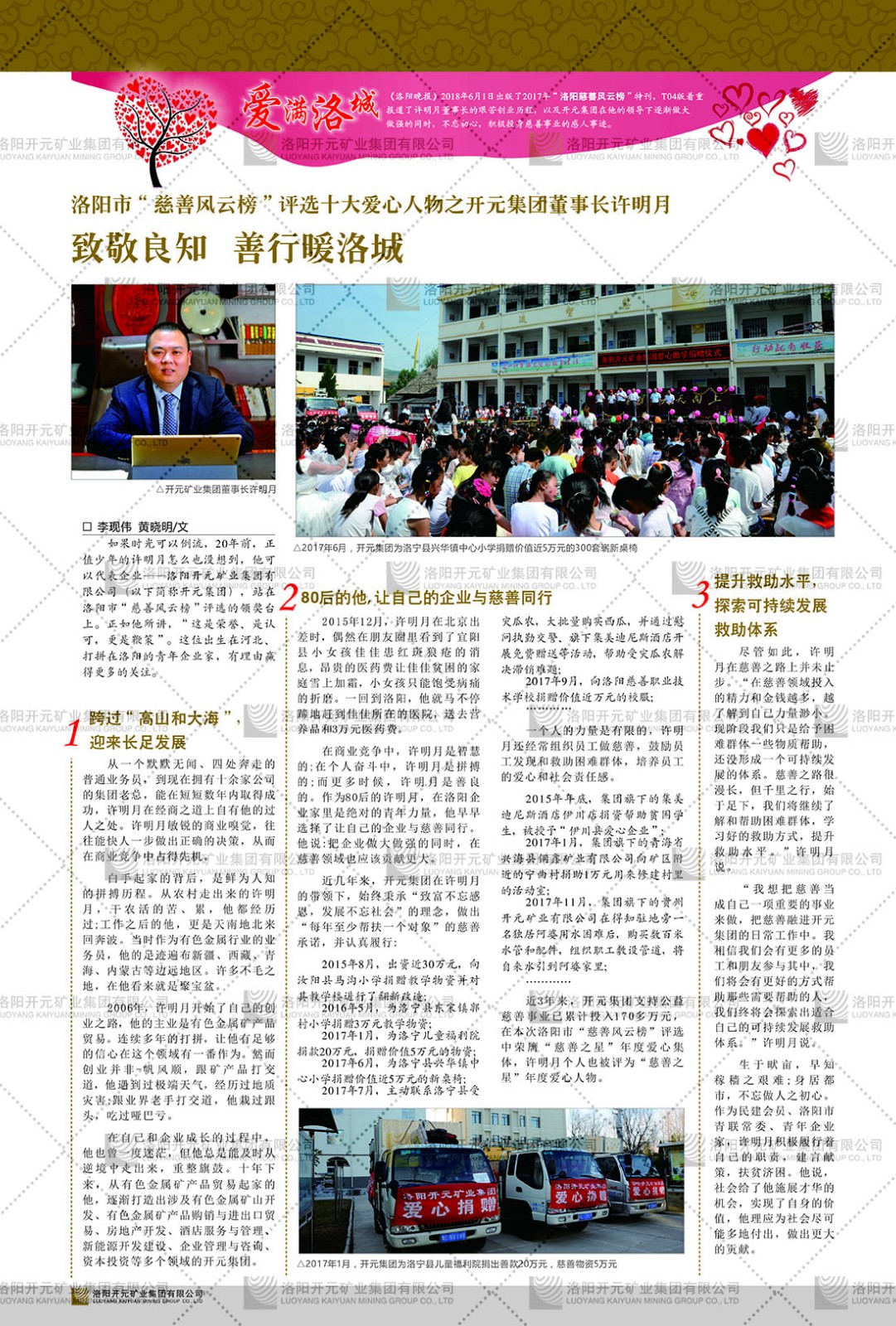 洛陽開元礦業(yè)集團(tuán)有限公司簡介洛陽開元礦業(yè)集團(tuán)有限公司,始成立于2006年,位于洛陽市開元大道269號。集團(tuán)旗下共有十余家全資子公司,業(yè)務(wù)涉及有色金屬礦山開發(fā)、礦產(chǎn)品購銷與進(jìn)出口貿(mào)易、房地產(chǎn)開發(fā)、文化藝術(shù)、企業(yè)管理與咨詢、資本投資等多個(gè)領(lǐng)域。2024年,集團(tuán)公司銷售總額達(dá)7.8億元。民建河南省委委員、民建河南省委企業(yè)委副主任、民建洛陽市委委員、企業(yè)委主任、洛陽民建企業(yè)家協(xié)會會長許明月是公司創(chuàng)始人,現(xiàn)任洛陽開元礦業(yè)集團(tuán)有限公司董事長。在礦業(yè)領(lǐng)域,洛陽開元礦業(yè)集團(tuán)擁有多家實(shí)力雄厚的子公司:貴州開元礦業(yè)有限公司探、采礦權(quán)面積共11.33平方公里;興??h銅鑫礦業(yè)有限公司探礦權(quán)面積8.76平方公里,礦山資源潛力巨大;2021年,開元集團(tuán)與盧氏中科礦業(yè)有限公司開展戰(zhàn)略合作。盧氏中科礦業(yè)有限公司專注于有色金屬的浮選、加工和銷售,擁有強(qiáng)大的技術(shù)支撐平臺,是集探、采、選、冶、研為一體的中大型綜合礦業(yè)企業(yè)。目前,盧氏中科王家河1000噸選礦廠已成功投產(chǎn),雙河金礦、柳關(guān)欒盧鉛鋅礦相繼順利開工,樓房銀礦與圪老灣鉛鋅礦的深部探礦重大突破,標(biāo)志著礦山版圖取得重大進(jìn)展,為開元集團(tuán)后續(xù)發(fā)展奠定了堅(jiān)實(shí)基礎(chǔ)。在文化傳媒領(lǐng)域,洛陽市明月美術(shù)館通過豐富多樣的藝術(shù)展覽、學(xué)術(shù)研討和公共教育活動(dòng),努力打造一個(gè)集展覽、交流、教育、研究為一體的綜合性藝術(shù)平臺。此外,在金融投資領(lǐng)域,開元集團(tuán)旗下的北京明峰資本管理有限公司專注于投資具有高增長潛力的優(yōu)秀企業(yè),特別是高科技、新能源、環(huán)保等新興產(chǎn)業(yè),為客戶提供個(gè)性化的資產(chǎn)配置服務(wù)。在做好企業(yè)經(jīng)營的同時(shí),開元集團(tuán)始終不忘企業(yè)的社會責(zé)任和家國情懷,以突出的愛心公益事跡,開展了一系列公益慈善活動(dòng):“民建林”公益事業(yè)通過“思源基金”“幫幫公益”線上公益平臺,與眾多愛心人士籌措資金20余萬元;資助541名貧困大學(xué)生共計(jì)270余萬元,推進(jìn)“數(shù)字助力——河南AI人才培養(yǎng)”;捐款10萬元,馳援京津冀、黑龍江洪水地質(zhì)災(zāi)害……公司于2017年底被洛陽市慈善總會評為“洛陽慈善風(fēng)云榜——十大愛心集體”。洛陽開元礦業(yè)集團(tuán)有限公司秉承持續(xù)發(fā)展理念,憑借多年來良好的企業(yè)信譽(yù)與經(jīng)營業(yè)績,與全國多家企業(yè)建立了良好合作關(guān)系,受到社會各界的一致好評,多次榮獲“納稅標(biāo)兵”“先進(jìn)企業(yè)”“招商引資模范企業(yè)”等榮譽(yù)稱號。回望來時(shí)路,開元人勠力同心,以“闖”的精神和“創(chuàng)”的勁頭,一路披荊斬棘,踏過千山萬水;展望新未來,開元人凝心聚力,不執(zhí)于“舊”,無畏于“新”,秉承“勇于跨越,追求卓越”的企業(yè)精神,乘著國家高質(zhì)量發(fā)展新征程的東風(fēng),跨過高山,越過大海,向著集團(tuán)多元化、國際化的目標(biāo),逐夢遠(yuǎn)航,跨越前行!