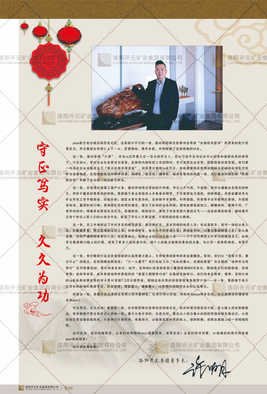 洛陽開元礦業(yè)集團(tuán)有限公司簡介洛陽開元礦業(yè)集團(tuán)有限公司,始成立于2006年,位于洛陽市開元大道269號。集團(tuán)旗下共有十余家全資子公司,業(yè)務(wù)涉及有色金屬礦山開發(fā)、礦產(chǎn)品購銷與進(jìn)出口貿(mào)易、房地產(chǎn)開發(fā)、文化藝術(shù)、企業(yè)管理與咨詢、資本投資等多個(gè)領(lǐng)域。2024年,集團(tuán)公司銷售總額達(dá)7.8億元。民建河南省委委員、民建河南省委企業(yè)委副主任、民建洛陽市委委員、企業(yè)委主任、洛陽民建企業(yè)家協(xié)會(huì)會(huì)長許明月是公司創(chuàng)始人,現(xiàn)任洛陽開元礦業(yè)集團(tuán)有限公司董事長。在礦業(yè)領(lǐng)域,洛陽開元礦業(yè)集團(tuán)擁有多家實(shí)力雄厚的子公司:貴州開元礦業(yè)有限公司探、采礦權(quán)面積共11.33平方公里;興??h銅鑫礦業(yè)有限公司探礦權(quán)面積8.76平方公里,礦山資源潛力巨大;2021年,開元集團(tuán)與盧氏中科礦業(yè)有限公司開展戰(zhàn)略合作。盧氏中科礦業(yè)有限公司專注于有色金屬的浮選、加工和銷售,擁有強(qiáng)大的技術(shù)支撐平臺,是集探、采、選、冶、研為一體的中大型綜合礦業(yè)企業(yè)。目前,盧氏中科王家河1000噸選礦廠已成功投產(chǎn),雙河金礦、柳關(guān)欒盧鉛鋅礦相繼順利開工,樓房銀礦與圪老灣鉛鋅礦的深部探礦重大突破,標(biāo)志著礦山版圖取得重大進(jìn)展,為開元集團(tuán)后續(xù)發(fā)展奠定了堅(jiān)實(shí)基礎(chǔ)。在文化傳媒領(lǐng)域,洛陽市明月美術(shù)館通過豐富多樣的藝術(shù)展覽、學(xué)術(shù)研討和公共教育活動(dòng),努力打造一個(gè)集展覽、交流、教育、研究為一體的綜合性藝術(shù)平臺。此外,在金融投資領(lǐng)域,開元集團(tuán)旗下的北京明峰資本管理有限公司專注于投資具有高增長潛力的優(yōu)秀企業(yè),特別是高科技、新能源、環(huán)保等新興產(chǎn)業(yè),為客戶提供個(gè)性化的資產(chǎn)配置服務(wù)。在做好企業(yè)經(jīng)營的同時(shí),開元集團(tuán)始終不忘企業(yè)的社會(huì)責(zé)任和家國情懷,以突出的愛心公益事跡,開展了一系列公益慈善活動(dòng):“民建林”公益事業(yè)通過“思源基金”“幫幫公益”線上公益平臺,與眾多愛心人士籌措資金20余萬元;資助541名貧困大學(xué)生共計(jì)270余萬元,推進(jìn)“數(shù)字助力——河南AI人才培養(yǎng)”;捐款10萬元,馳援京津冀、黑龍江洪水地質(zhì)災(zāi)害……公司于2017年底被洛陽市慈善總會(huì)評為“洛陽慈善風(fēng)云榜——十大愛心集體”。洛陽開元礦業(yè)集團(tuán)有限公司秉承持續(xù)發(fā)展理念,憑借多年來良好的企業(yè)信譽(yù)與經(jīng)營業(yè)績,與全國多家企業(yè)建立了良好合作關(guān)系,受到社會(huì)各界的一致好評,多次榮獲“納稅標(biāo)兵”“先進(jìn)企業(yè)”“招商引資模范企業(yè)”等榮譽(yù)稱號?;赝麃頃r(shí)路,開元人勠力同心,以“闖”的精神和“創(chuàng)”的勁頭,一路披荊斬棘,踏過千山萬水;展望新未來,開元人凝心聚力,不執(zhí)于“舊”,無畏于“新”,秉承“勇于跨越,追求卓越”的企業(yè)精神,乘著國家高質(zhì)量發(fā)展新征程的東風(fēng),跨過高山,越過大海,向著集團(tuán)多元化、國際化的目標(biāo),逐夢遠(yuǎn)航,跨越前行!